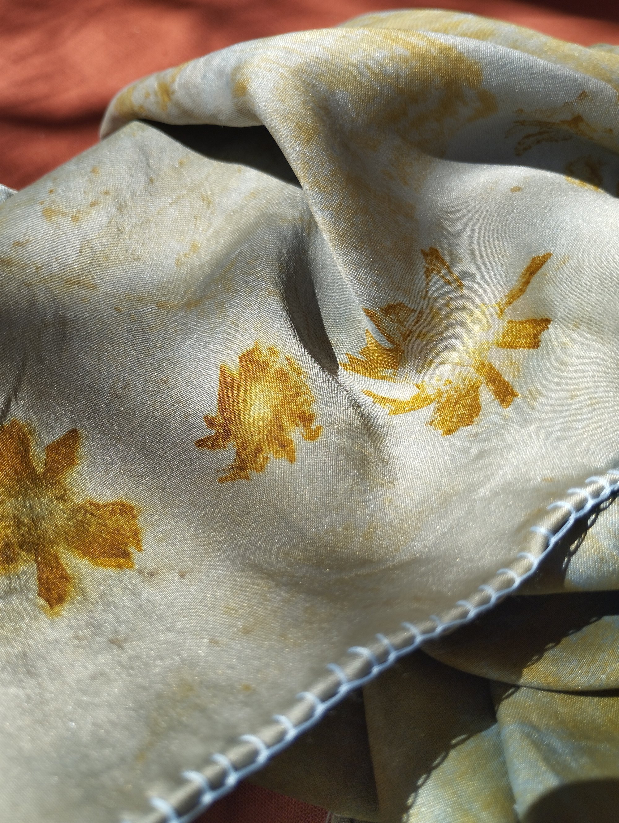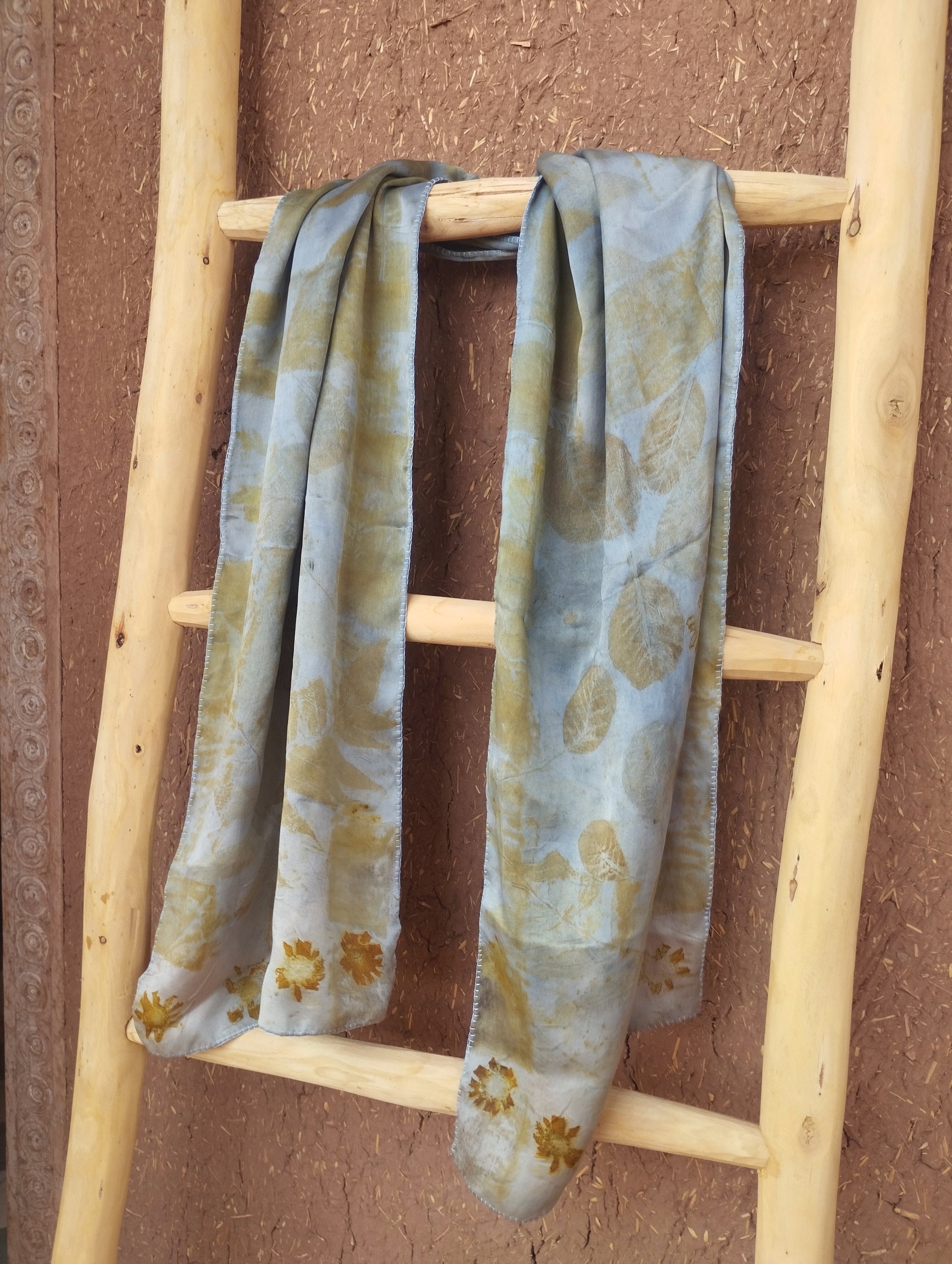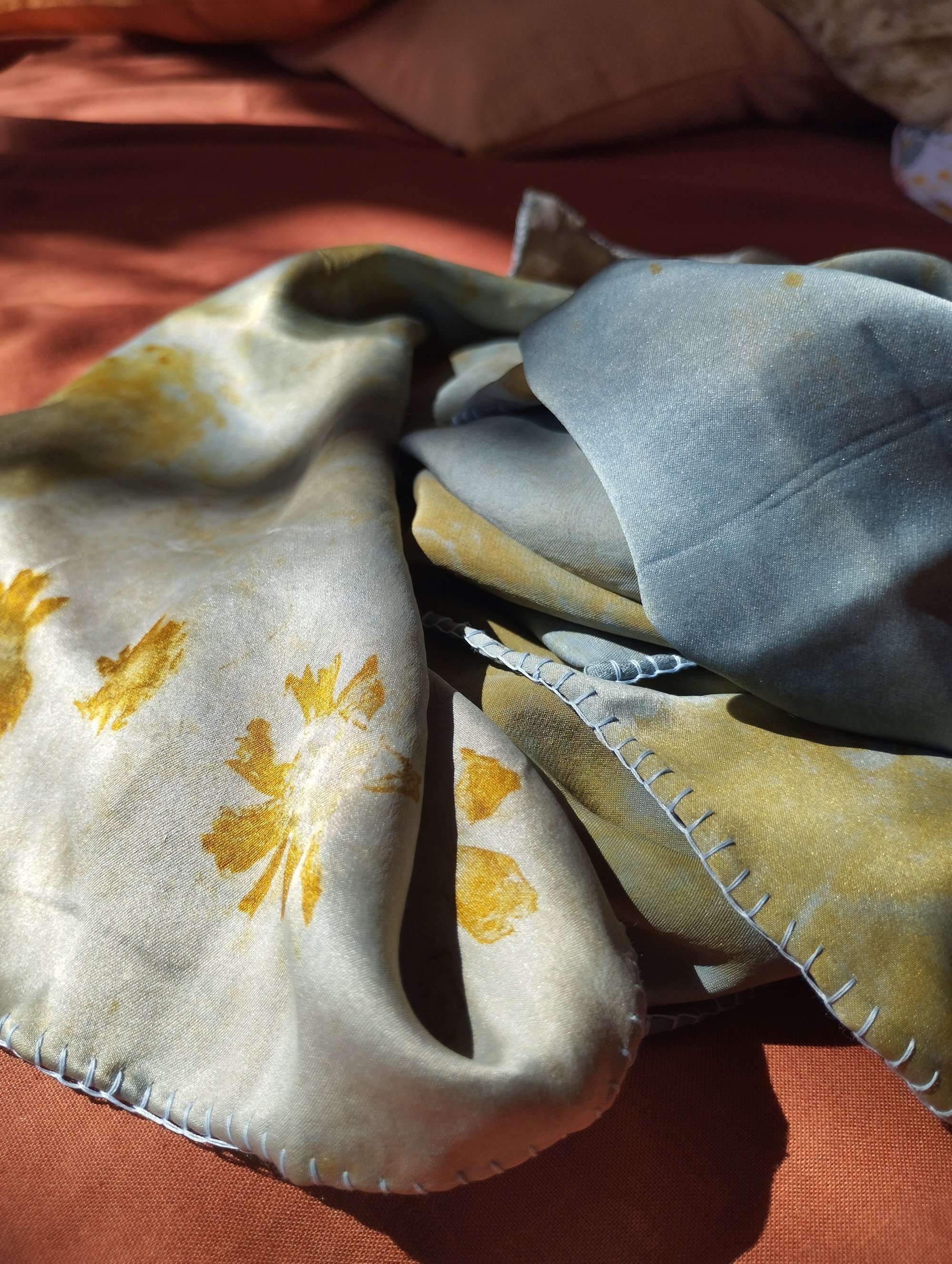 100 % Silk , Hand dyed using home grown botanicals, locally foraged finds & traditional natural dye extracts.