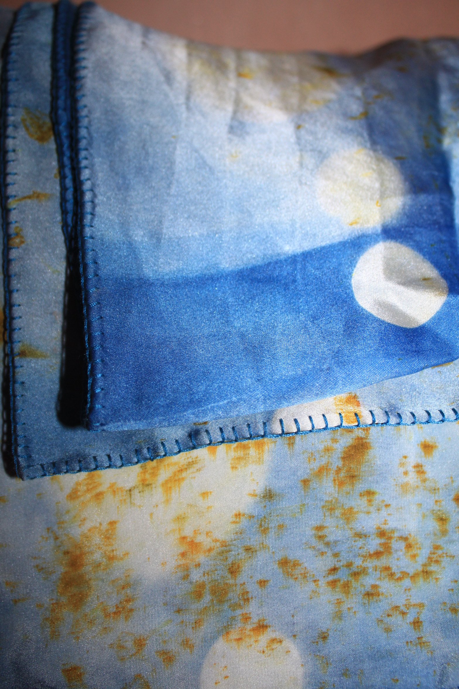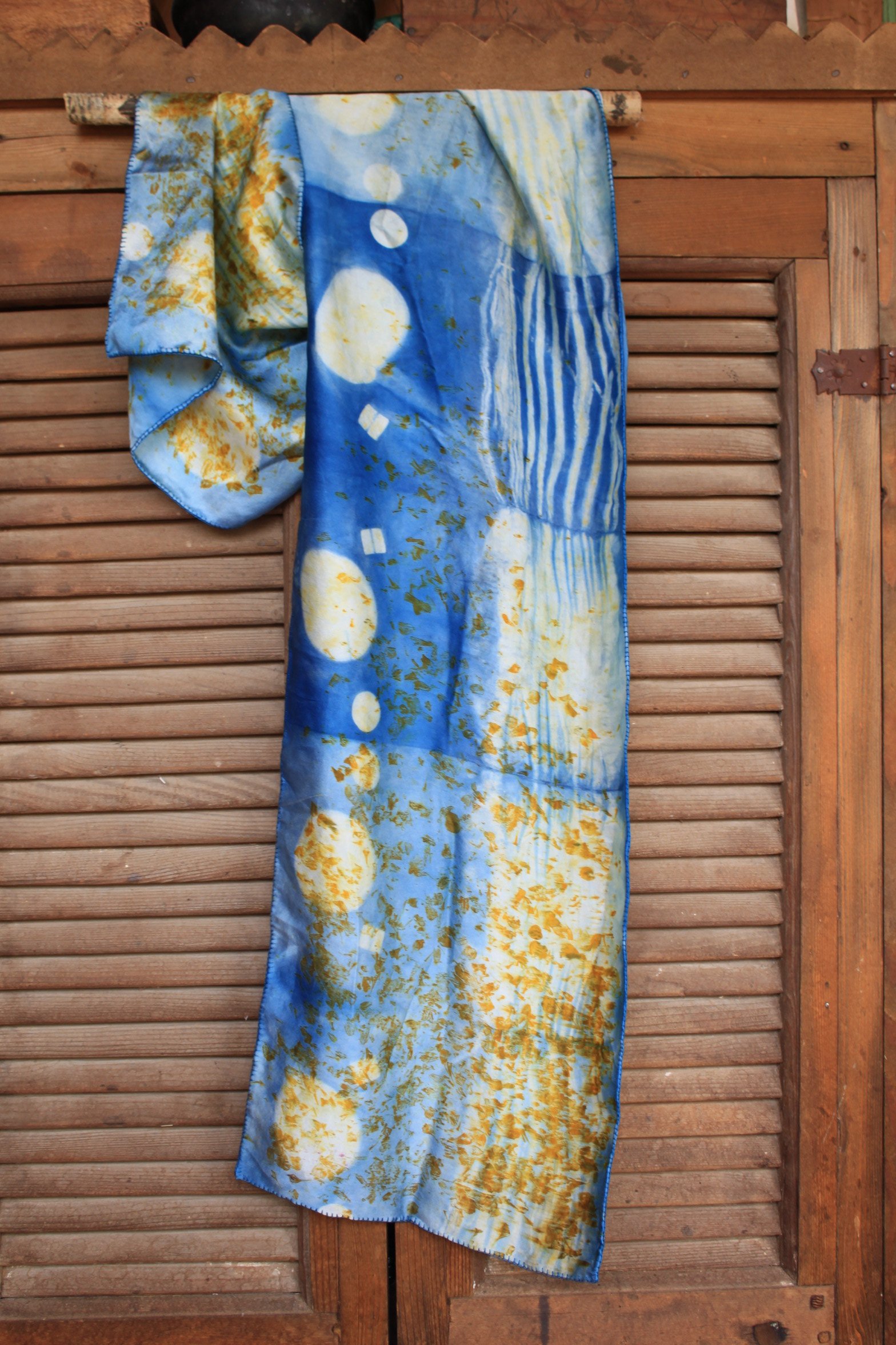 100 % Silk , Hand dyed using home grown botanicals, locally foraged finds & traditional natural dye extracts.